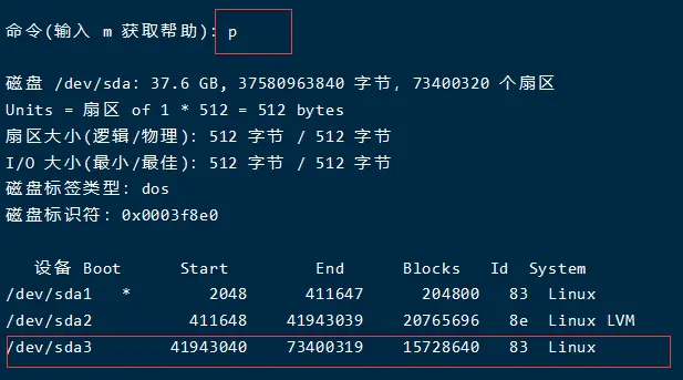 8.继续在终端命令窗口中输入“p”回车,查看当前分区的信息,在显示的信息中就可以看到已经多了一个新的分区了,大小就是刚设置的大小。如图: