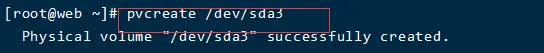 12.在终端命令窗口中输入“# pvcreate /dev/sda3”命令并回车,初始化刚建立的分区。如图: