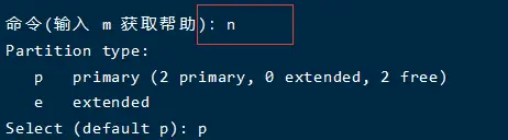 5.在终端命令中,输入“n”命令,回车,新增一个分区。如图: