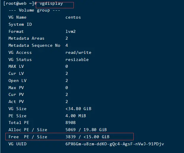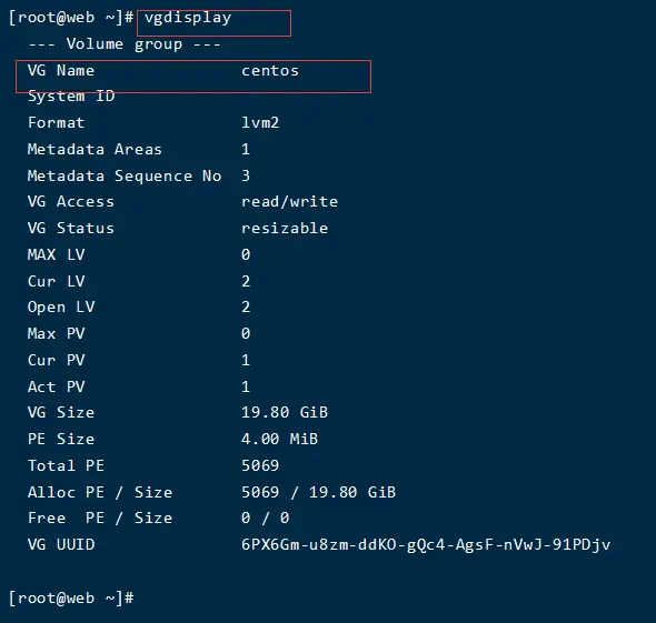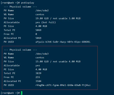 17.继续在终端命令窗口中输入“# pvdisplay”命令并回车,查看当前的卷组,在显示的信息中卷组已经扩容成功了,接下来需要将文件系统也扩容。如图: