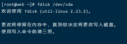 3.接着,在终端界面中输入“# fdisk /dev/sda”命令,对新加的磁盘进行分区操作(选择新增的磁盘),并回车。如图: