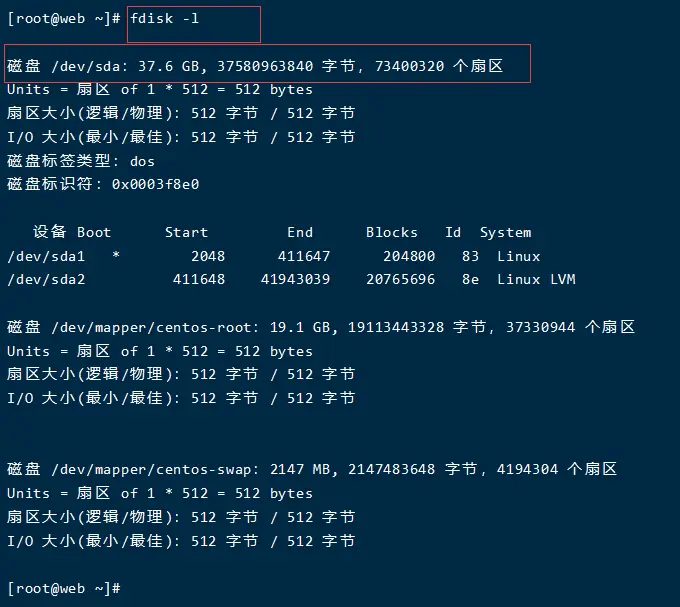 2.接着,在终端界面中输入“# fdisk -l”命令,查看新磁盘的分区信息。如图: