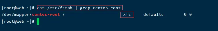 18.继续在终端命令窗口中输入“# cat /etc/fstab | grep centos-root”命令并回车,查看文件系统的格式。如图: