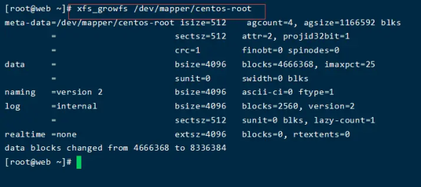 19.在上一步已经看到了文件系统的格式了,就需要使用相应的命令来扩展磁盘空间,在终端命令中输入“# xfs_growfs /dev/mapper/centos-root”命令并回车(命令:# xfs_growfs 文件系统名,不同的文件系统要用不同的命令,不然会导致报错)。如图:
