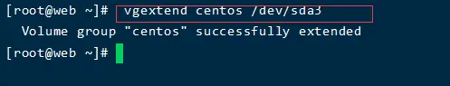 13.终端命令窗口中输入“# vgextend centos /dev/sda3”命令并回车,把刚初始化的分区加入到虚拟卷组名中(命令:# vgextend 虚拟卷组名 新增的分区)。如图: