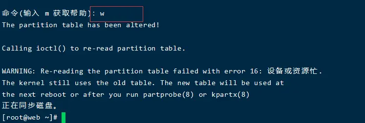 9.在终端命令中输入“w”命令,回车,写入磁盘信息并保存。如图: