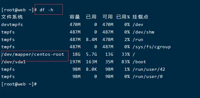 15.继续在终端命令窗口中输入“# df -h”命令并回车,查看并记下需要扩展的文件系统名(/dev/mapper/centos-root,不同版本查看到的应该有所区别)。如图: