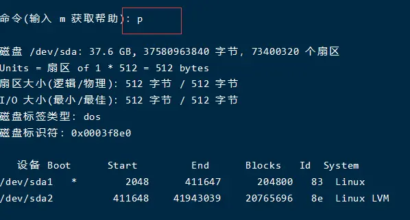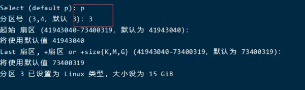 8.继续在终端命令窗口中输入“p”回车,查看当前分区的信息,在显示的信息中就可以看到已经多了一个新的分区了,大小就是刚设置的大小。如图: