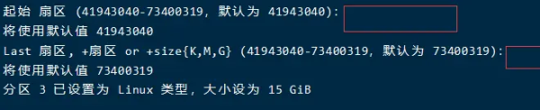 7.在显示的起始扇区直接敲回车键,在弹出的Last后面中,直接敲回车键即可进入下一步(在如图画框位置直接使用回车即可进入下一步)。如图: