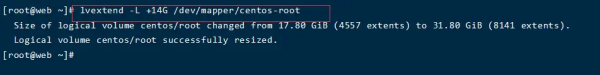 20.等待系统自动扩容完成,完成后,在终端命令窗口中输入“# df -h”命令并回车,查看磁盘大小是否扩容成功,在显示的磁盘信息中,可以看到磁盘扩容成功了。