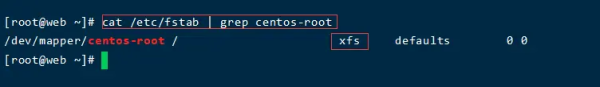 18.继续在终端命令窗口中输入“# cat /etc/fstab | grep centos-root”命令并回车,查看文件系统的格式。如图: