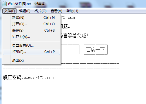 1、如下图,把西西软件园.txt打印,选择打印菜单: